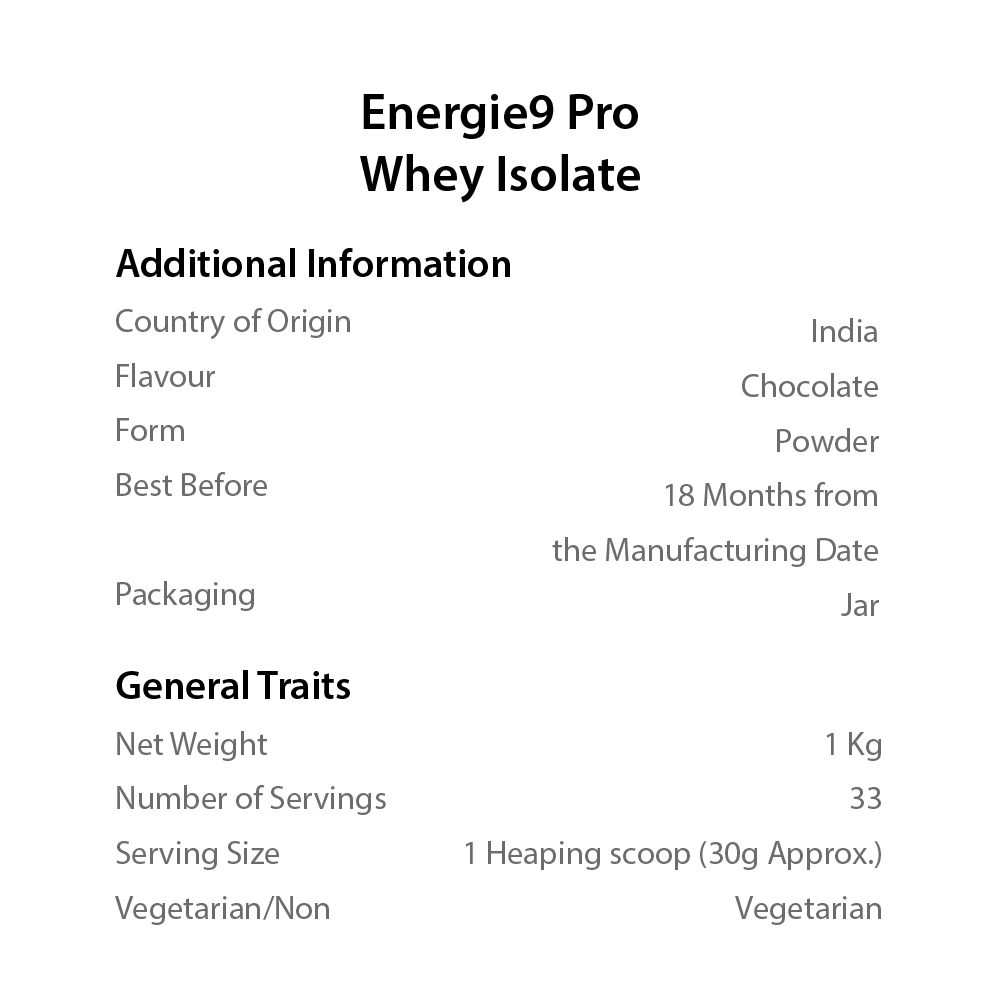 Energie9 Pro Whey Isolate is a premium quality product that contains high-quality Whey protein isolate imported from the USA & added digestive enzymes. It helps to build lean muscles, maximiz