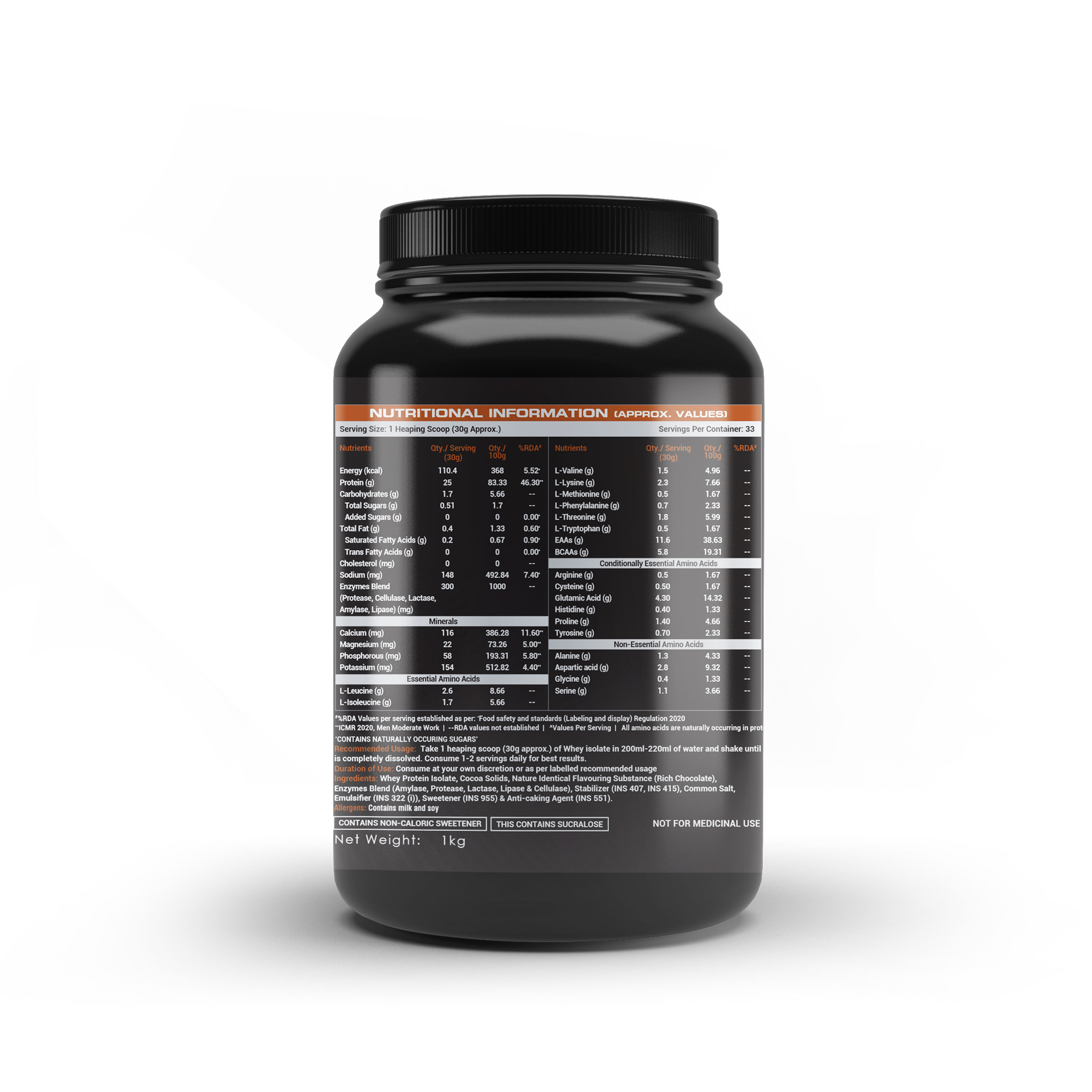 INGREDIENTS: Whey Protein Isolate, Cocoa Solids, Nature Identical Flavouring Substance (Rich Chocolate), Enzymes Blend (Amylase, Protease, Lactase, Lipase & Cellulase), Stabilizer (INS 407, INS 415), Common Salt, Emulsifier (INS 322 (i)), Sweetener (INS 955) & Anti-caking Agent (INS 551).